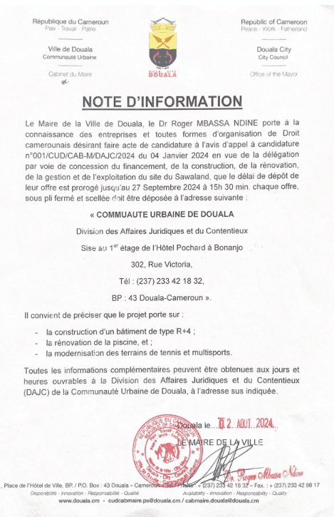 Par conséquent, chaque offre sous pli fermé et scellée doit être déposé à la division des affaires juridiques du contentieux de la communauté urbaine de Douala sise au 1er étage de l’hôtel Pochard de Douala-Bonanjo.