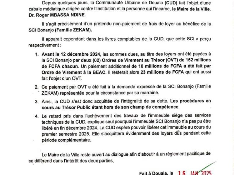 Accusée de filouterie de loyer par la SCI selon une information qui a défrayé la chronique ces dernières semaines, la Communauté Urbaine de Douala sort du silence pour clarifier la situation. Un communiqué signé par délégation de son secrétaire général Armand Charles Metha le 16 janvier 2025 y apporte des…